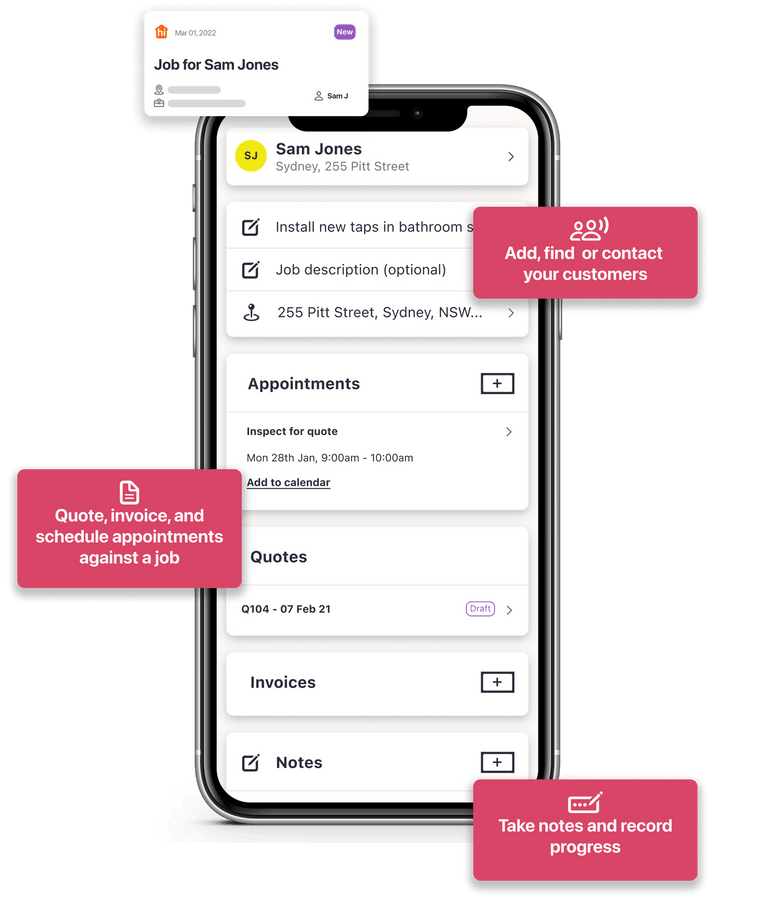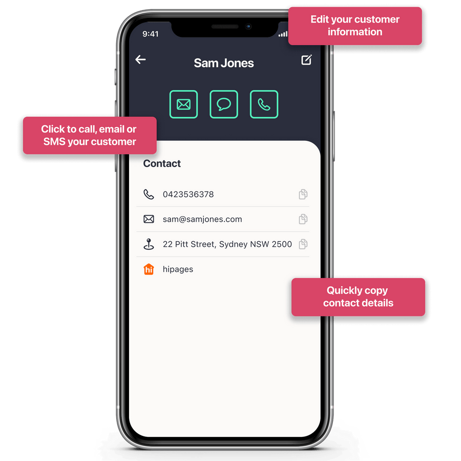 Customer profiles are linked to related jobs, quotes and invoices so you can manage your pipeline.